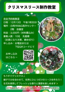 今回は12月13日(土曜日)に開催される『クリスマスリース制作教室』のお知らせです。