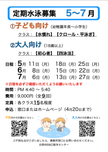 5〜7月の定期水泳教室の追加募集のお知らせになります!