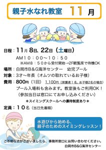 11月 親子水慣れ教室のご案内 作成日 2025年10月16日2025年10月16日 by shiraoka-admin 11月の親子水なれ教室の日程になります。 時間が10:00〜10:50となっていますので、お間違いないようにお願いいたします。 参加方法は当日窓口にお越しください(8:50から受付開始となります!)