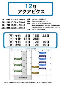12月 アクアビクスのご案内 作成日 2025年11月16日2025年11月16日 by shiraoka-admin 12月のアクアビクスの日程表になります。 月・木・金で行ってますので、ご興味がある方は是非お越しください。 また、曜日によって開催時間が異なるため、ご注意ください! ※お申し込みは参加当日窓口で行っています。