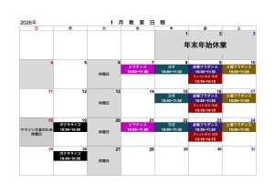 1月 2階教室のご案内 作成日 2025年12月5日2025年12月5日 by shiraoka-admin 1月の2階教室の日程になります。 様々な教室を開催していますので、ご興味がある方は是非お越しください。(体験も可能です!) ※ピラティスとボクササイズは当日参加型になりますので、体験等は行っていません。ご注意ください。