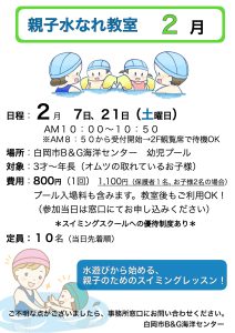 2月 親子水なれ教室のご案内 作成日 2026年1月18日 by shiraoka-admin 2月の親子水なれ教室の日程になります。 時間が10:00〜10:50となっていますので、お間違いないようにお願いいたします。 参加方法は当日窓口にお越しください(8:50から受付開始となります!)