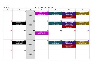 3月 2階教室のご案内 作成日 2026年2月10日2026年2月10日 by shiraoka-admin 3月の2階教室の日程になります。 様々な教室を開催していますので、ご興味がある方は是非お越しください。(体験も可能です!) ※ピラティスとボクササイズは当日参加型になりますので、体験等は行っていません。ご注意ください。