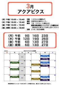 3月 アクアビクスのご案内 作成日 2026年2月10日 by shiraoka-admin 3月のアクアビクスの日程表になります。 月・木・金で行ってますので、ご興味がある方は是非お越しください。 また、曜日によって開催時間が異なるため、ご注意ください! ※お申し込みは参加当日窓口で行っています。